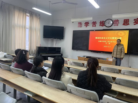 12月7日中午,365英国在线体育第二党支部书记马娟在碧螺校区D101开展以《推进社会主义文化繁荣兴盛》为主题的党课。本次党课围绕“文化自信是更基本、更深沉、更持久的力量;坚持用社会主义核心价值观凝心聚力;进行无愧于时代的文艺创造”三个方面展开阐述。