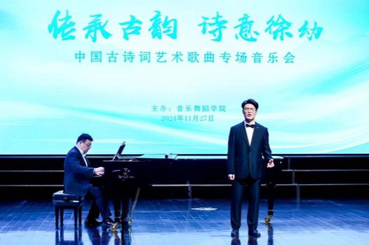 音乐会由23级音乐表演班的何从畅、丁曦两位同学出演,刘雅宁博士指导完成。《大江东去》的壮阔、《幽兰操》的高洁、《水调歌头·明月几时有》的哲思、《定风波·莫听穿林打叶声》的豁达、《滚滚长江东逝水》的豪迈...一首首经典的古诗词,经由声乐的演绎,在现代焕发出新的生命力,仿佛穿越千年,与现场师生进行着心灵的交汇,以音符为笔,勾勒出一幅幅中华优秀传统文化的壮丽画卷,彰显其深厚底蕴与独特韵味。