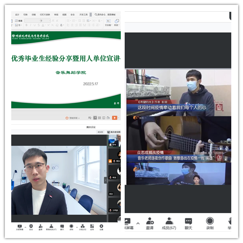 5月17日下午,公司第一期优秀毕业生经验分享暨用人单位宣讲会成功在线上以腾讯会议的形式召开,无锡志远文化艺术公司、晓雯音乐教育、尚萌幼教、小银星艺术团等4家用人单位及公司音乐表演专业的员工参加了此次宣讲会。