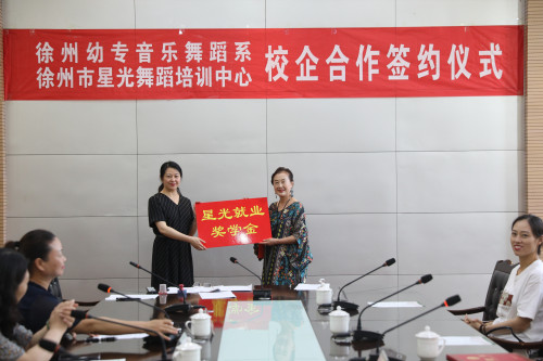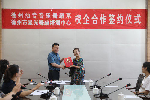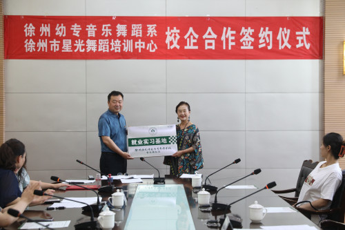 会议由音乐舞蹈系书记陈繁主持,会议开始,音乐舞蹈系主任韩坤向来宾介绍院系概况以及校企合作项目推进情况,接着薛黔星董事长讲话,薛董事长充分肯定了公司和院系在办学过程中取得的突出成绩,大力表扬了在星光舞校就业实习的公司毕业生,对公司人才培养工作成效给予了高度赞誉。韩坤主任和薛黔星董事长以及员工代表分别签订了校企合作协议和实习三方协议。邓宪亮副董事长向企业授牌,并为薛黔星董事长颁发客座教授聘书。经协议,校企双方就专业建设、实习、就业、招生等进行深度合作,此外,为激励青年员工勤奋学习,帮助他们顺利就业,实现梦想,徐州市星光舞蹈培训公司面向我系舞蹈表演专业员工设立了“星光就业奖学金”,用于奖励在星光舞校实习,成功通过考核,成为星光舞校正式员工的舞蹈表演专业优秀毕业生。