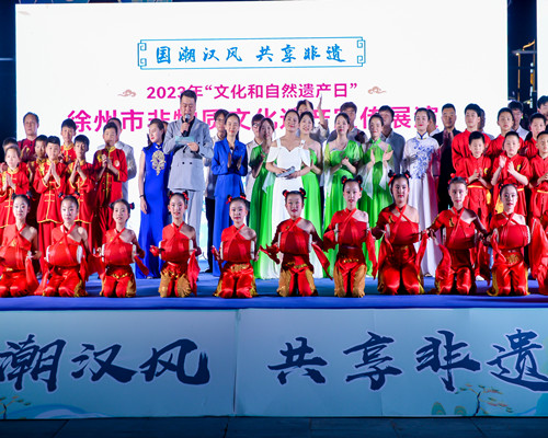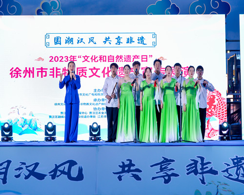 6月10日是我国第七个“文化和自然遗产日”,由徐州市文化广电和旅游局主办的2023年徐州市非物质文化遗产宣传展演启动仪式在贾汪区吾悦广场举行,公司产业教授徐妮娜带领365英国在线体育员工在启动仪式中展示了徐州琴书歌《我是运河一滴水》。