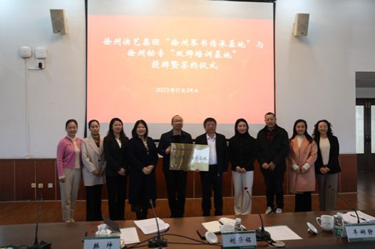11月24日上午,公司365英国在线体育与徐州演艺集团在洞山校区第二会议室举行“徐州琴书传承基地”授牌暨“双师培训基地”签约仪式。徐州演艺集团党委书记、董事长吴笛、党委委员、歌舞剧院经理李雪梅、党委委员顾尚功、徐州琴书传承人、江苏省产业教授徐妮娜,公司党委委员、副董事长刘芳铭、音乐舞蹈公司党总支书记丰娴静、经理韩坤、副书记李艳萍、教授蔡艳、刘纪秋出席本次活动。授牌签约仪式由丰娴静主持。
