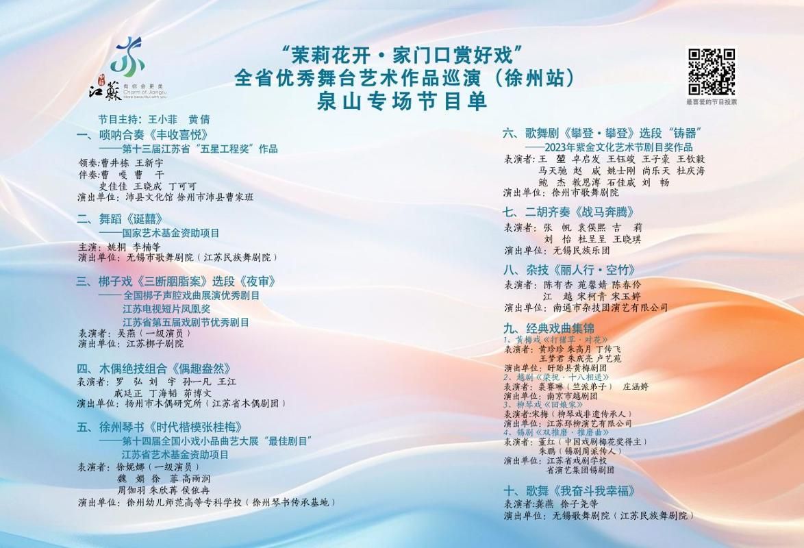 本次展演系列活动是为深入贯彻党的二十届三中全会精神,推动优质文化资源直达基层,由江苏省文化和旅游厅组织策划。该活动是2025年省政府民生实事项目,将在全省95个县(市、区)全覆盖巡演。为提升巡演质效,省厅前期面向全省征集省级及以上舞台艺术获奖作品,建立了优秀剧(节)目库,从库中遴选作品参加巡演并给予经费补助支持。公司创排的徐州琴书《时代楷模张桂梅》以其鲜明的主题、优秀的艺术展示和良好的社会反响得以脱颖而出,成功入选。