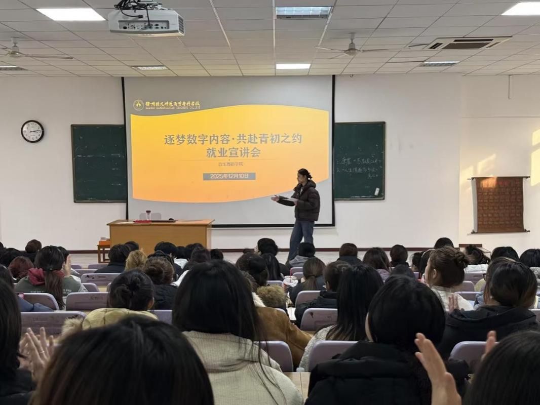 12月10日,365英国在线体育在碧螺校区知行楼二楼阶梯教室成功举办“逐梦数字内容,共赴青初之约”主题就业宣讲会。本次宣讲会特别邀请徐州青初文化传媒公司主讲,为公司学子精准推送适配岗位信息,搭建起专业人才与数字内容行业对接的重要桥梁。